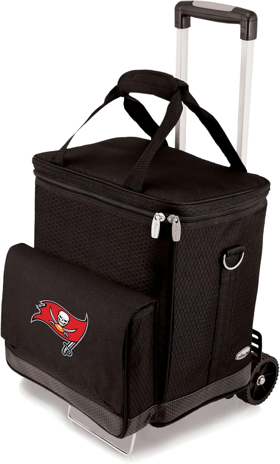 This Picnic Time NFL Cellar with Trolley insulated 6-bottle wine carrier features padded, removable interior dividers and a removable water-resistant interior lining, allowing you to convert the Cellar into a rolling cooler to tote your food and beverages. The exterior is made of durable ripstop polyester in solid black with a water-resistant PVC base, and your favorite team's logo graces the front of the cellar. The interior is fully-insulated 420D nylon in gray. The adjustable shoulder strap has a floating comfort pad so you can carry the Cellar however it is most comfortable. ThermoGuard insulation and a pearlized foil lid help keep your wine or food cool for hours, and an extra large gusseted pocket is located on the front exterior for you to store valuables or other food items. The wheeled trolley is 39 inches tall, (18 inches folded) and has a maximum weight capacity of 77 pounds. Whether you're using the Cellar with Trolley to transport wine, or a picnic lunch, the easy-glide wheels and telescoping handle will make your journey effortless. Case measures 12.5 by 13 by 11, and handle extends to 39 inches; Comes with Lifetime Limited Warranty.