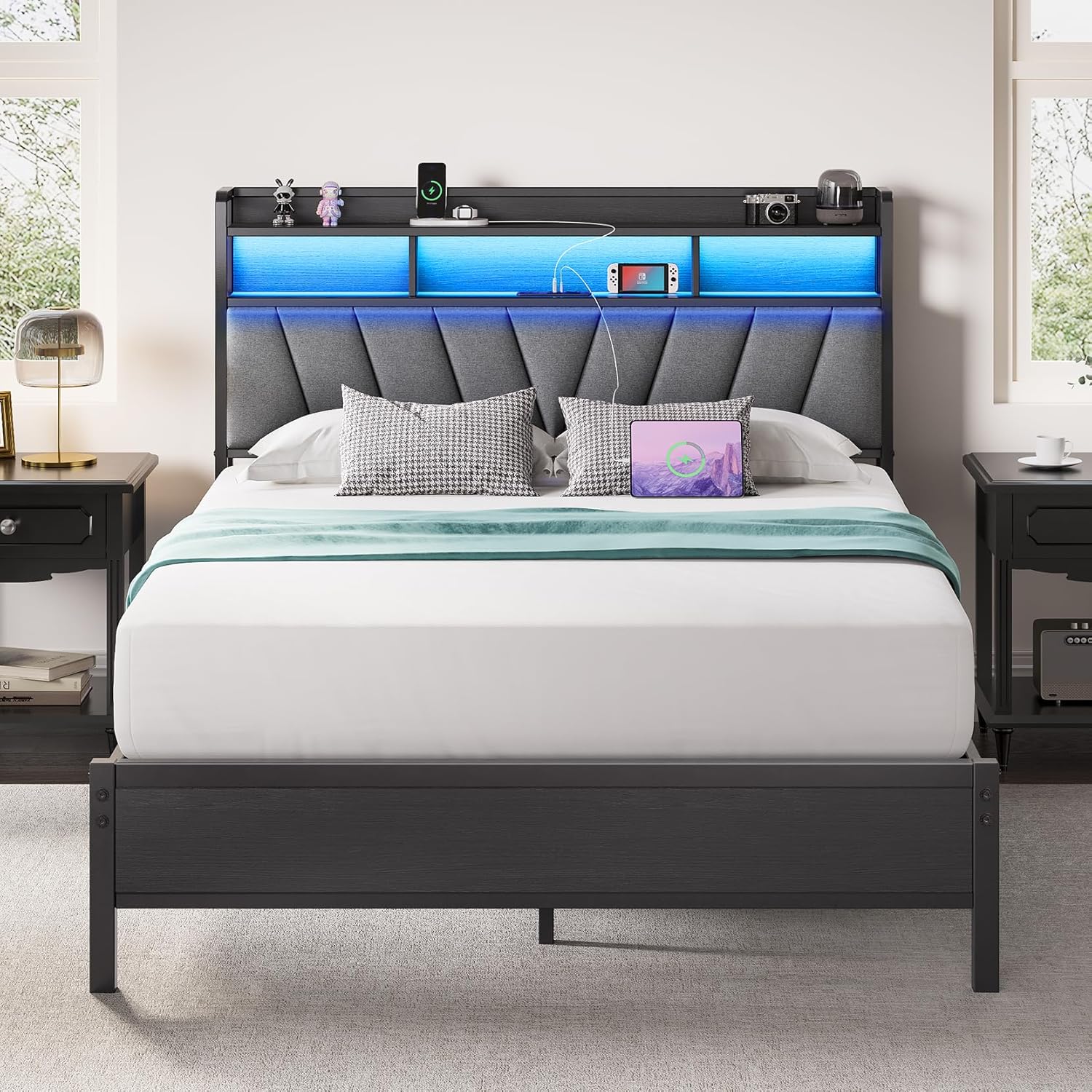 Queen Bed Frame with Headboard, LED Lights Queen Size Bed Frame with Storage Drawers & Charging Station, Heavy Duty Metal Slats, Noise-Free, No Box Spring Needed, Easy Assembly, Brown
