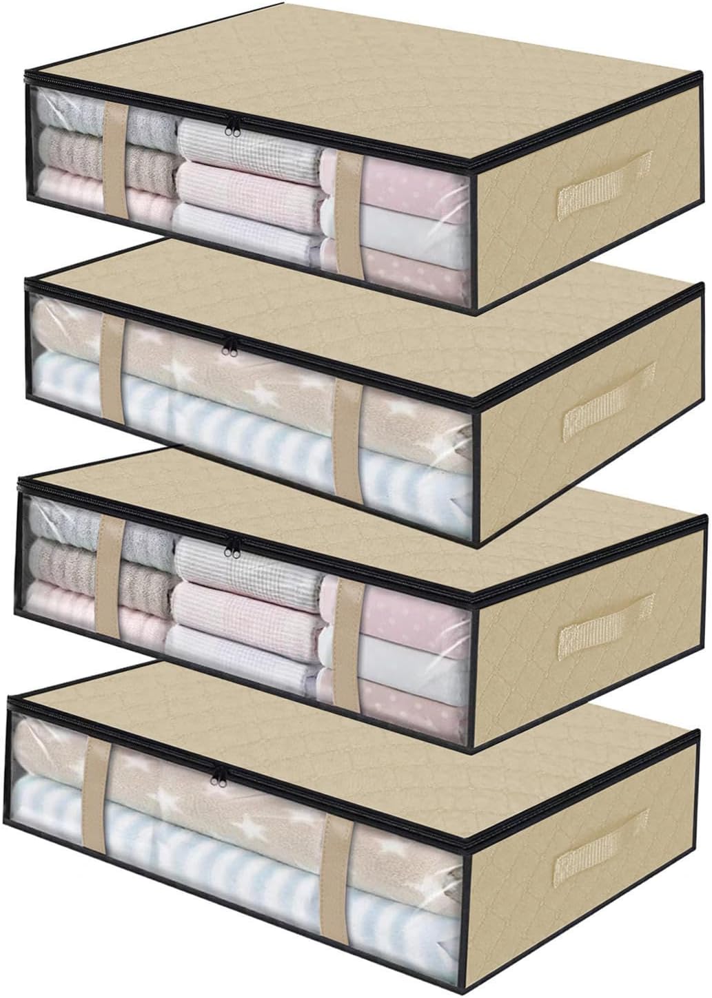 The storage organizer can be used for wardrobes, bedroom, dormitory and utility room. The portable design and premium fabric used in the construction of these bags make them versatile and suitable for a wide range of storage needs. Large Capacity Storage Foldable and Portable Design These storage bags have sturdy construction and can handle all types of storage needs. The sturdy stitched handles are convenient to pull the storage bag and to carry easily. Clear PVC window, this clothes storage bag allows you to easily identify the items stored inside without opening or rummaging. Material: Breathable Nonwoven Fabric Color: Grey/Black/Beige Design: Transparent Window & 4 Reinforced Handles Single Organizer Size of Unfold: 23.62x17.7x5.9 in ( 60x45x15cm ) Product Content: 4 pieces one set Package included: 4 x Underbed Storage Bins Warning: 1. Manual measurement, please allow slight errors on size. 2. Color may exist slight difference due to different displays..